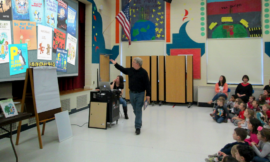 The artist, Tim Young, holds a dry-erase board while he sketches. He is standing in front of a large projection displaying his illustrated book covers.